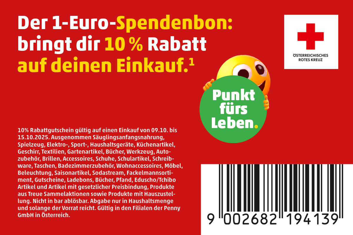 * -10% Rabattgutschein gültig auf einen Einkauf von 09.10. bis 15.10.2025. Ausgenommen Säuglingsanfangsnahrung, Spielzeug, Elektro-, Sport-, Haushaltsgeräte, Küchenartikel, Geschirr, Textilien, Gartenartikel, Bücher, Werkzeug, Autozubehör, Brillen, Accessoires, Schuhe, Schulartikel, Schreibware, Taschen, Badezimmerzubehör, Wohnaccessoires, Möbel, Beleuchtung, Saisonartikel, Sodastream, Fackelmannsortiment, Gutscheine, Ladebons, Bücher, Pfand, Eduscho/Tchibo Artikel und Artikel mit gesetzlicher Preisbindung, Produkte aus Treue Sammelaktionen sowie Produkte mit Hauszustellung. Nicht in bar ablösbar. Abgabe nur in Haushaltsmenge und solange der Vorrat reicht. Gültig in den Filialen der Penny GmbH in Österreich.