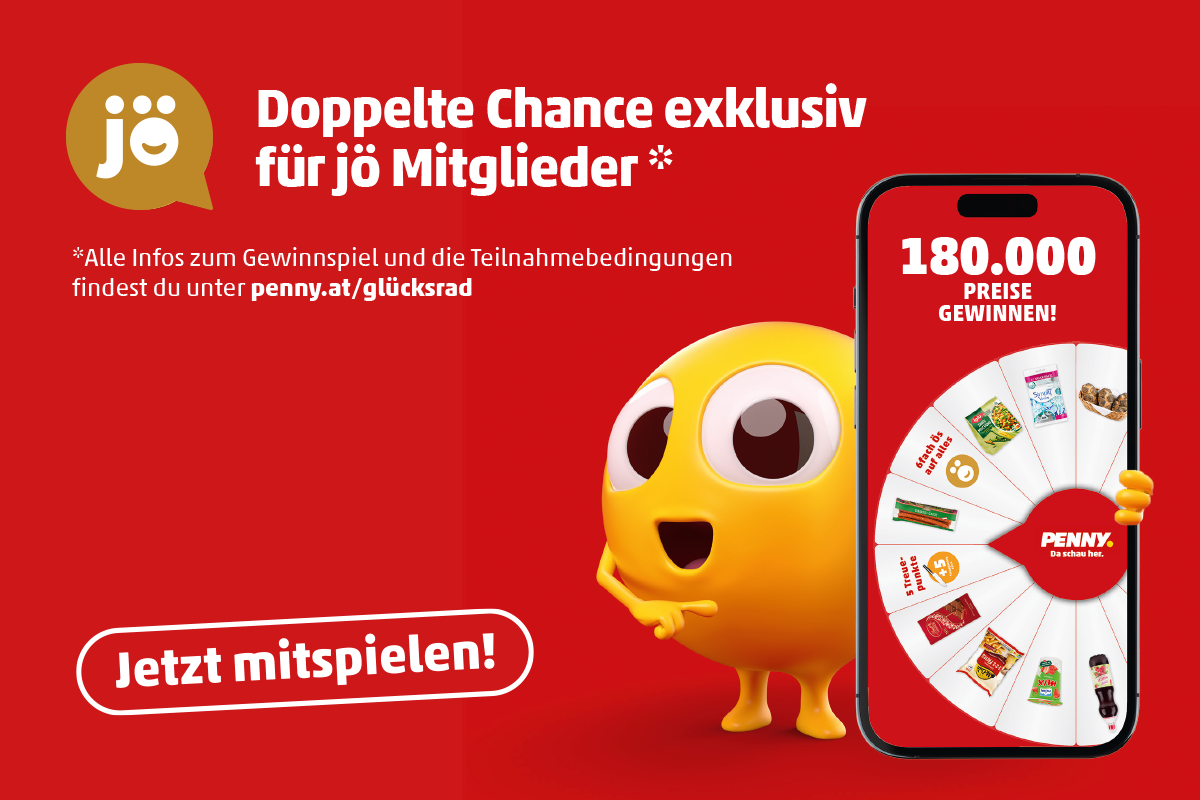 Bei der Verknüpfung der PENNY APP und des jö Kontos profitiert man von allen digitalen jö Vorteilen und kann zwei Mal täglich am GLÜCKSRAD drehen, sofern beim ersten Mal verloren wurde. So erhöht sich deine Gewinnchance pro Tag.
