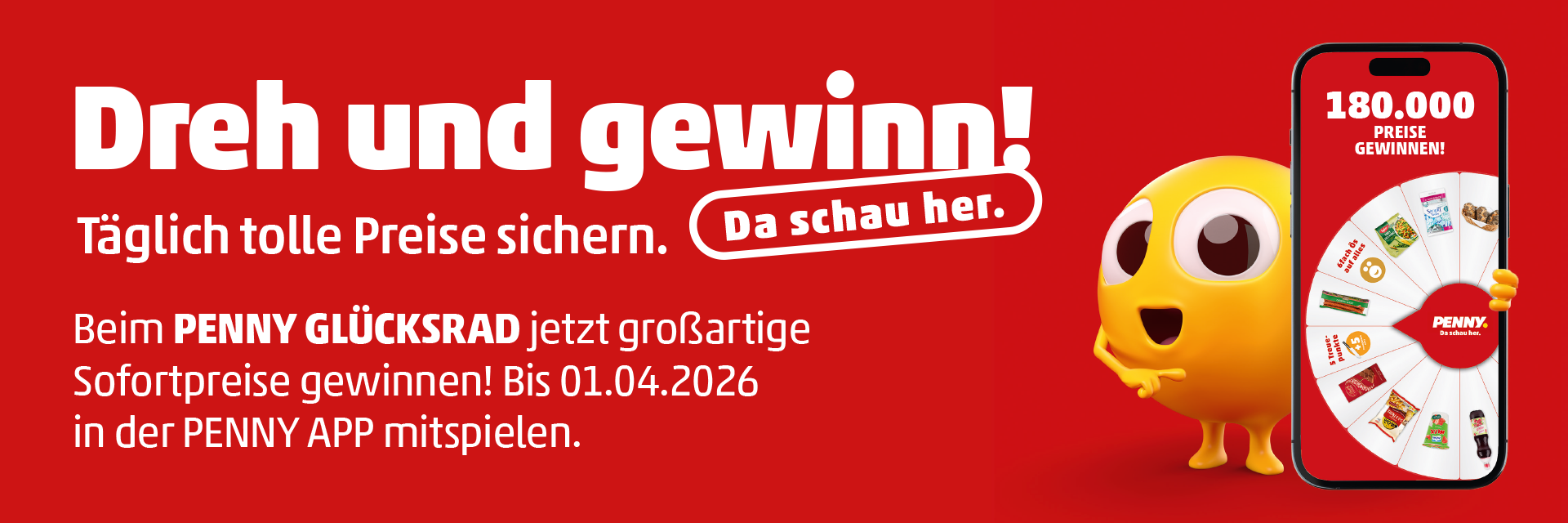 Von 19. Februar bis 01. April 2026 gibt's beim PENNY GLÜCKSRAD täglich in der PENNY APP die Chance auf 180.000 Gewinne – dazu zählt ein Mix aus Produkten von bekannten Marken sowie den hochwertigen PENNY Eigenmarken wie "Ich bin Österreich" und ECHT BIO!.
