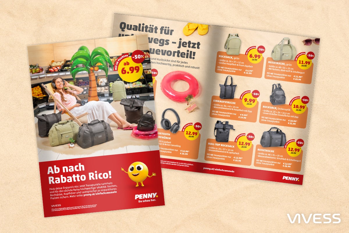 Pro 5 Euro Einkaufswert erhältst du in allen österreichischen PENNY Filialen von 23.04. bis 05.08.2026 einen Treuepunkt für deinen Sammelpass an der PENNY Kassa. Hast du 40 Punkte eingeklebt, bekommst du beim Kauf eines Vivess Reisebegleiters 50% Rabatt. Deinen Sammelpass kannst du bis zum 14.08.2026 in allen österreichischen PENNY Filialen (solange der Vorrat reicht) einlösen.