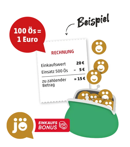 Mit dem jö Einkaufsbonus kannst du ganz einfach mit deinen gesammelten Ös bezahlen und dabei bares Geld sparen. 100 Ös = 1€. Somit reduziert sich der zu bezahlende Betrag auf der Rechnung.