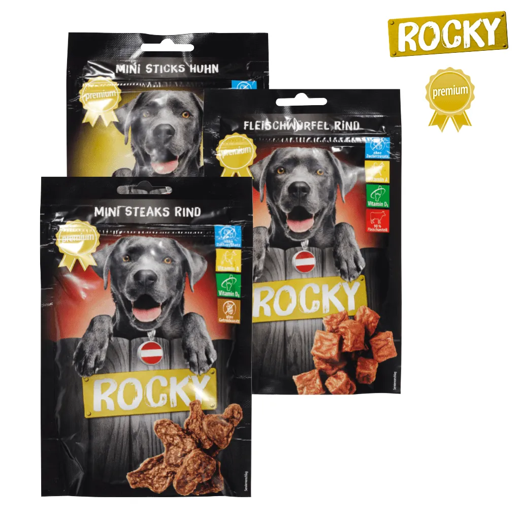 Für deinen besten Freund auf vier Beinen ist auch bei deinem PENNY gesorgt: Mit Rocky und Rocky Premium entstehen besondere Verwöhnmomente für deinen geliebten Vierbeiner: Hundesnacks, Premium Filets, Belohnungssticks und vieles mehr versprechen schmackhafte Mahlzeiten für einen ausgewogenen Genuss.