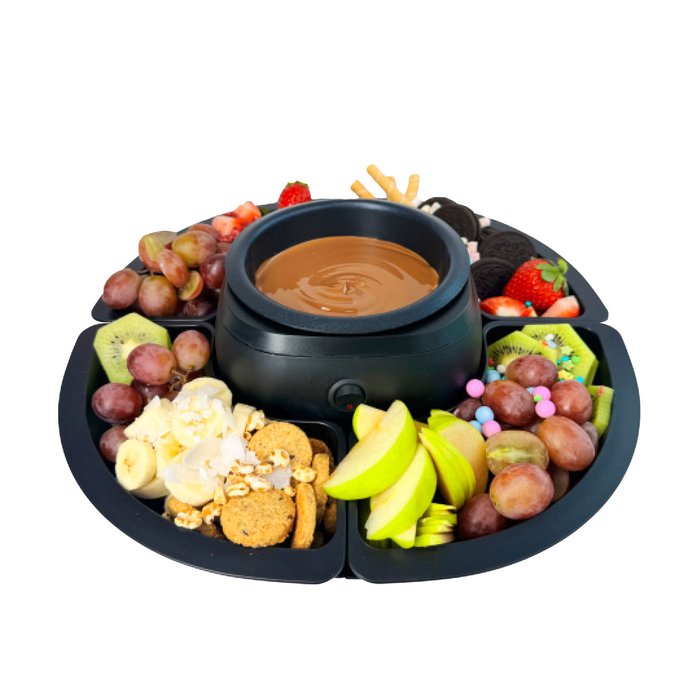 Temperatur: ca. 60 °C, ca. 500 ml abnehmbare Schmelzschale, 4 abnehmbare Servierfächer, inkl. 4 Edelstahl-Fonduegabeln, auch für z.B.: Karamell, Käse, Dips etc. verwendbar