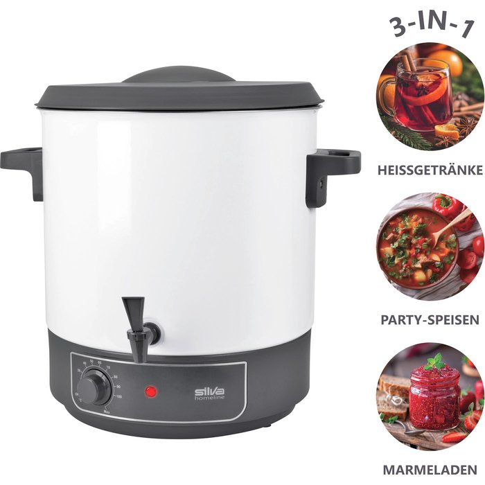 Nutzinhalt: ca. 23,5 Liter, Volumen: ca. 29 Liter, mit Auslaufhahn zum Abfüllen von Getränken, Temperaturregelungsbereich: 40 bis 110 °C, mit Thermostat, ca. 1.800 Watt, emailliertes Gehäuse, Größe: ca. 46 x 42,3 x 44,3 cm, inkl. Einlegerost und Blindverschraubung, zum Einkochen; vielseitig verwendbar