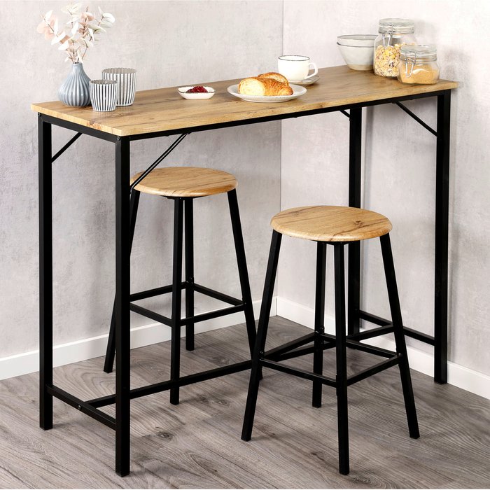 bestehend aus Tisch ca. 110 x 40 cm, Höhe ca. 88 cm und Hocker ca. 30 x 30 x 60 cm, in Eichenoptik aus FSC®-zertifizierter Faserplatte mit Metallbeinen