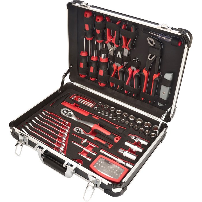 gefüllt mit reichhaltigem Sortiment für Haushalt, Werkstatt etc. z.B.: Bit-Schraubendreher, Universalmesser, Spannungsprüfer, Zangen u.v.m.