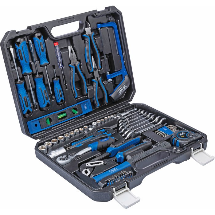 gefüllt mit reichhaltigem Werkzeugsortiment aus Chrom-Vanadium-Stahl , z.B.: Umschaltknarre, Stecknussadapter, Biteinsatz u.v.m.