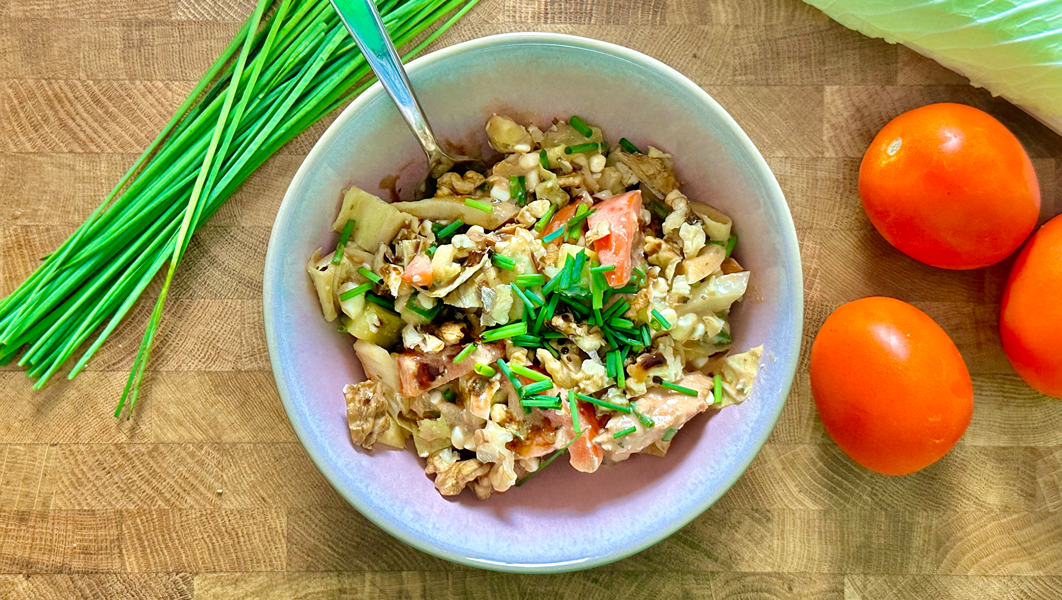 Zutaten für remove add Portion(en)1 DoseThunfisch3 mittlere Tomaten0.5 Gurke200 gCottage Cheese etwasBalsamicoessig zum marinieren etwasSchnittlauch oder Salatkräuter1 Hand vollWalnüsse150 gChinakohl1 PriseSalz1 PrisePfefferZubereiten