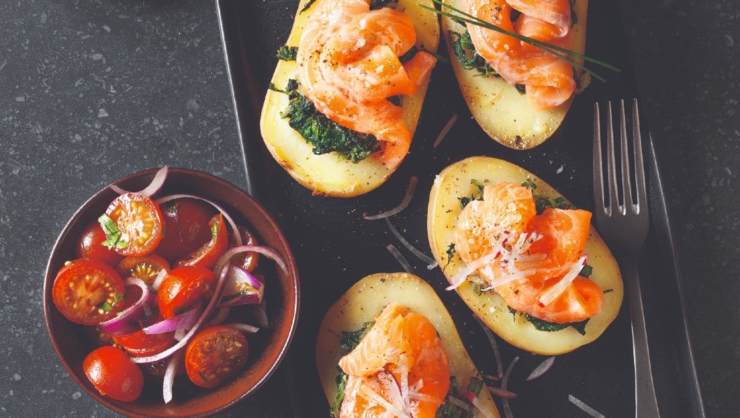 Gefüllte Erdäpfel mit Lachs und Blattspinat