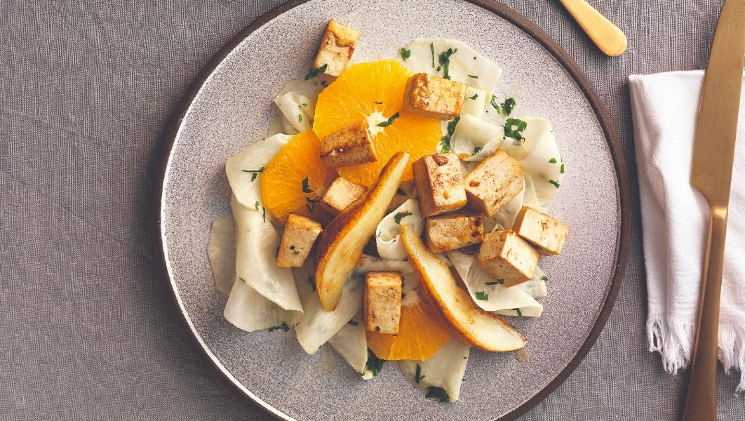 Sellerie-Birnen-Salat mit gebratenem Tofu