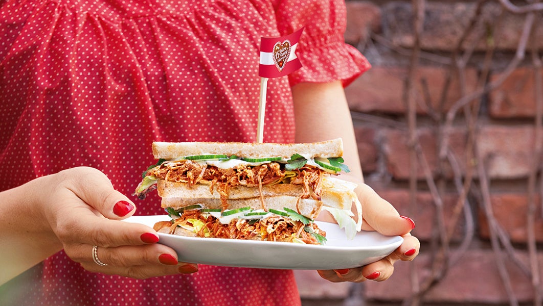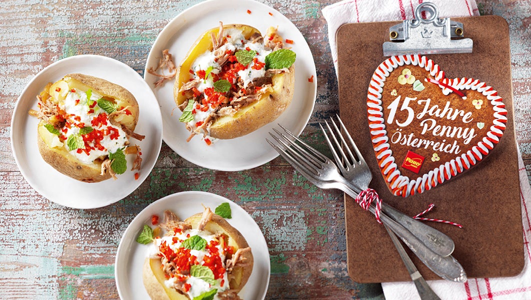 mit eingelegten Zwiebeln und Süßkartoffel-Pommes