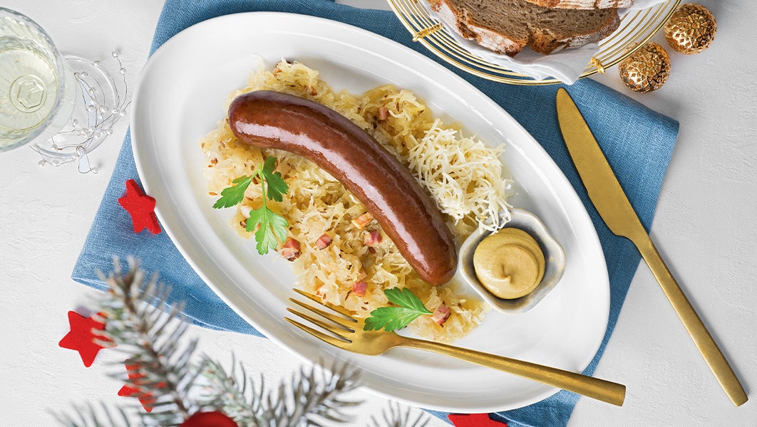 Selchwürstel mit Sauerkraut und Krustenbrot
