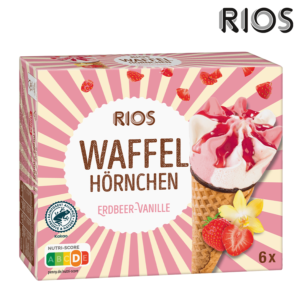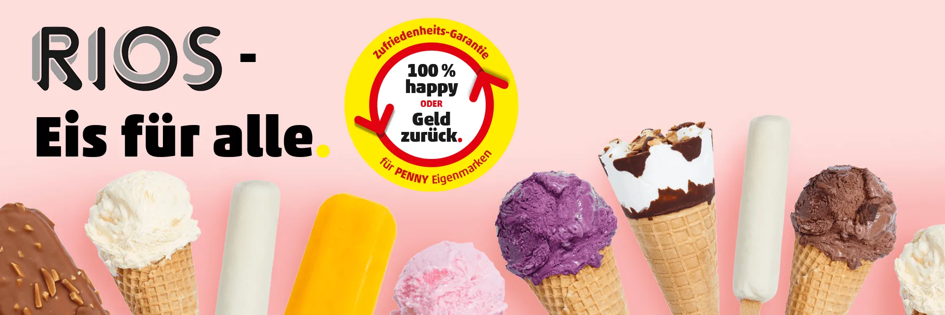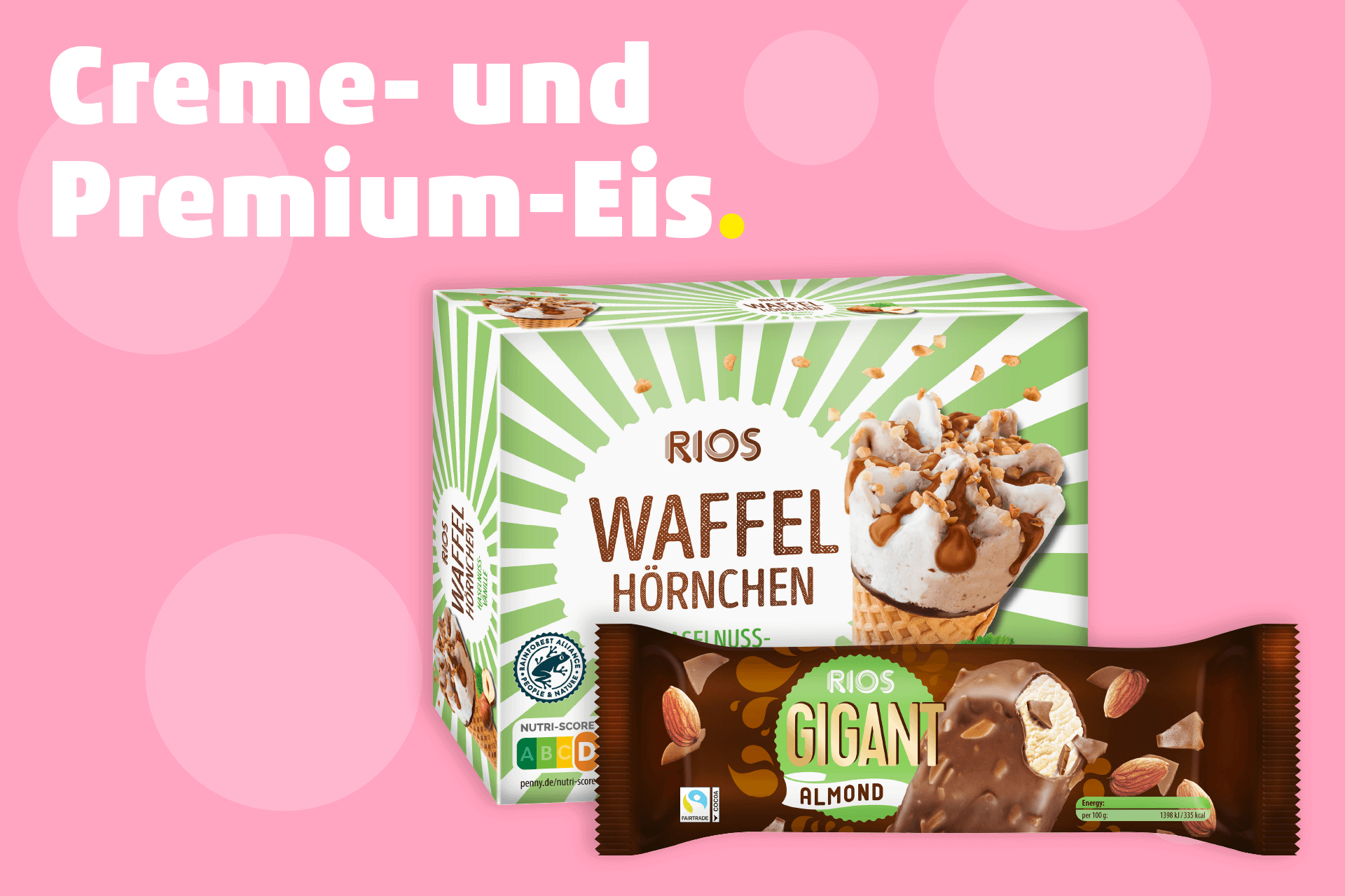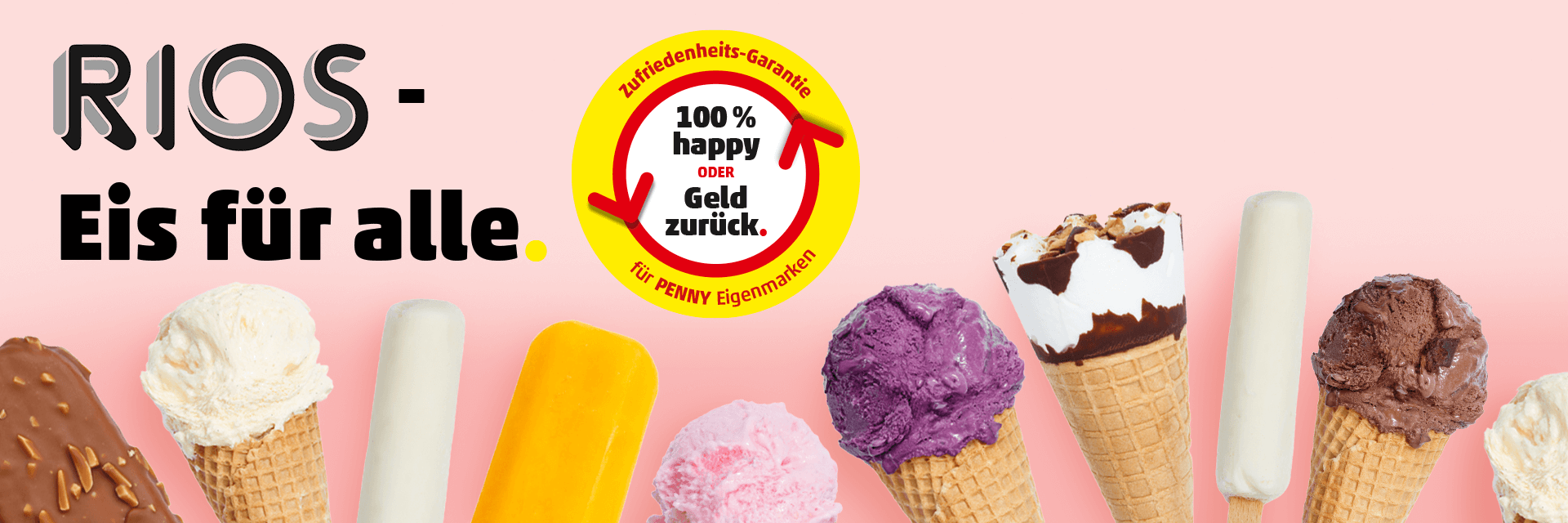 Ob ein zartschmelzendes Schokoladeneis am Stiel, cremiges Haselnuss-Vanille-Eis im leckeren Waffel Hörnchen oder die bunten Disco Pops mit cremiger Füllung - RIOS bieten dir bei deinem PENNY eine große Auswahl an Creme- und Premium-Eis.