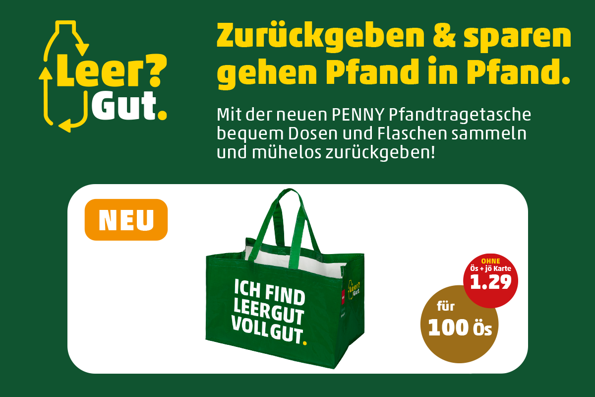 **Für nur 100 Ös erhältst du die PENNY Pfandtasche. Gutschein mit der jö Karte an der Kassa vorzeigen. Nicht in bar ablösbar und nicht übertragbar. Nicht mit anderen Rabatt-Gutscheinen kombinierbar. Abgabe nur in Haushaltsmengen und solange der Vorrat reicht. Gültig in den Filialen der PENNY GmbH in Österreich.