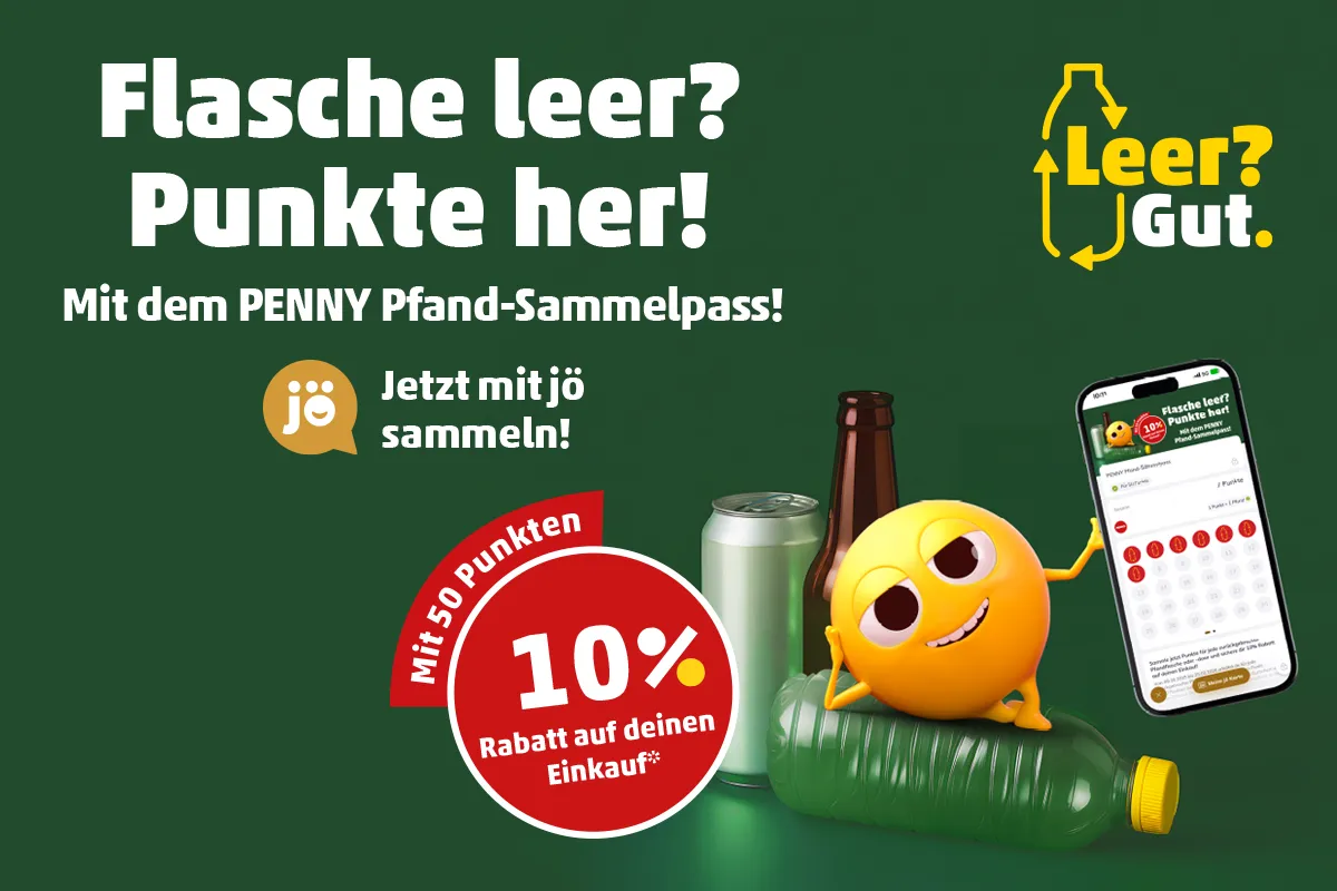 Flasche leer? Punkte her! ist das Motto des neuen PENNY Pfand-Sammelpass. Sammle jetzt als jö Mitglied Punkte für jede zurückgebrachte Pfandflasche oder -dose und erhalte ab 50 gesammelten Punkten einen 10% Rabattgutschein auf deinen Einkauf.*